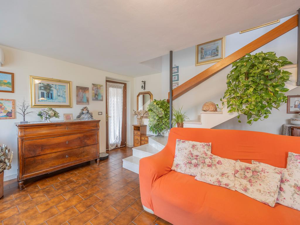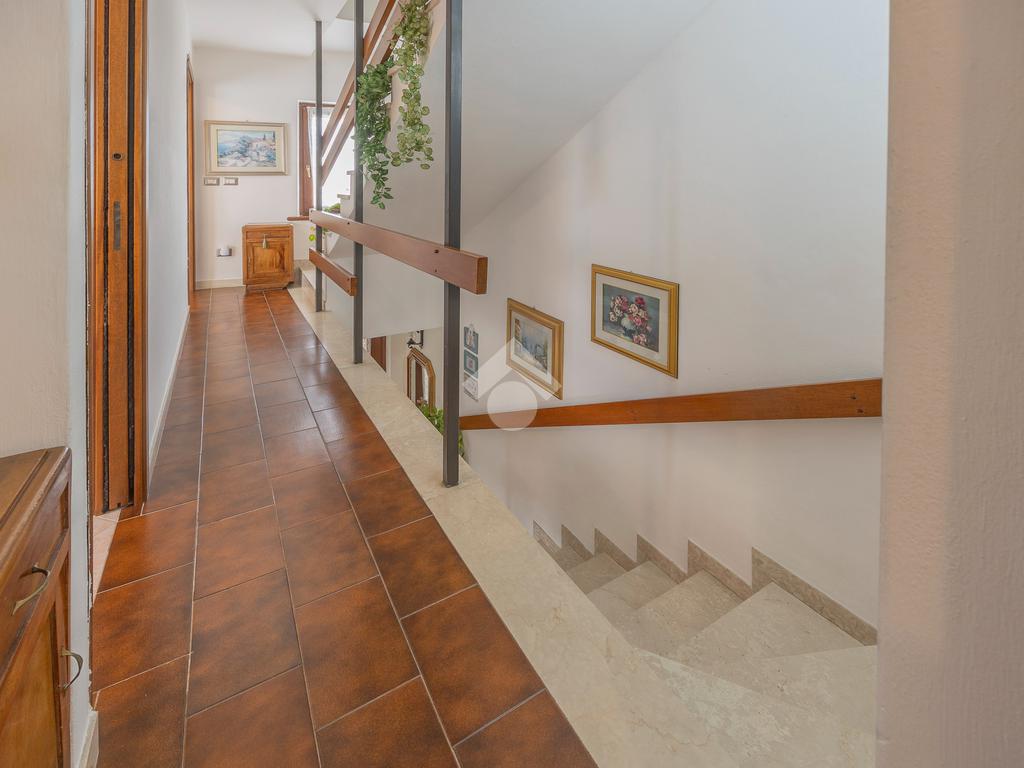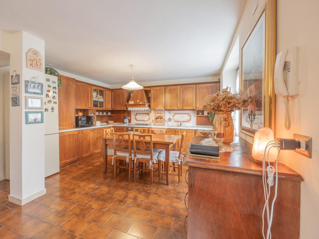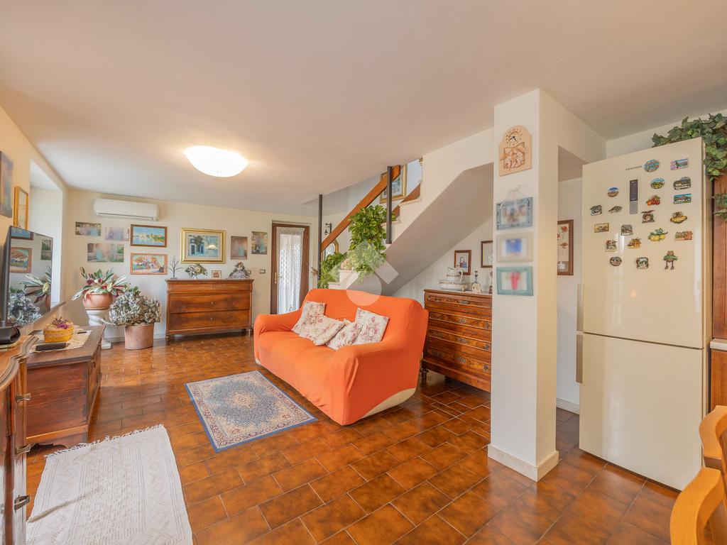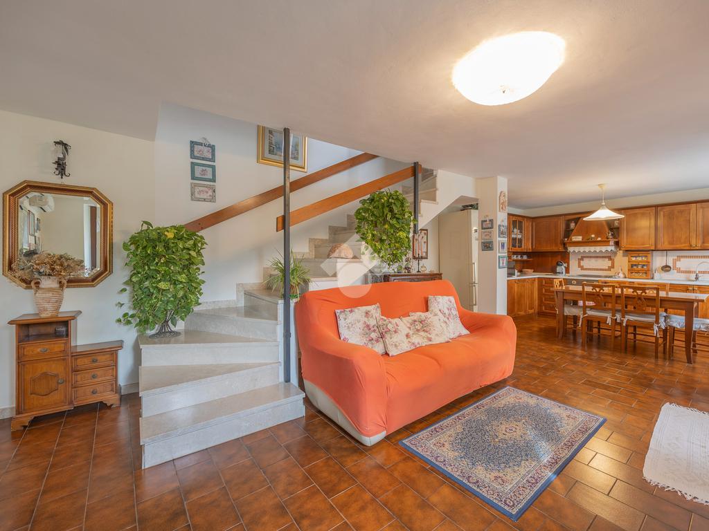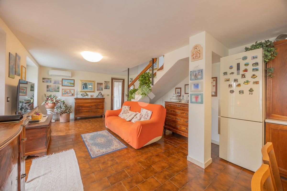 L’ingresso si apre su un’ampia zona giorno open space con scala a vista e cucina in muratura, ambiente caldo e accogliente valorizzato da pavimenti in cotto e finiture in legno che richiamano la tradizione delle abitazioni del centro.