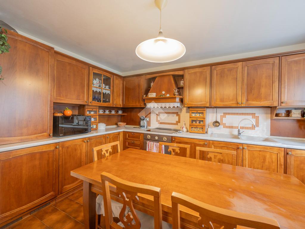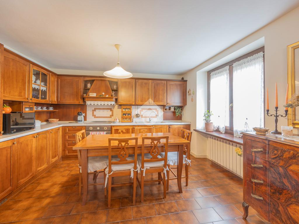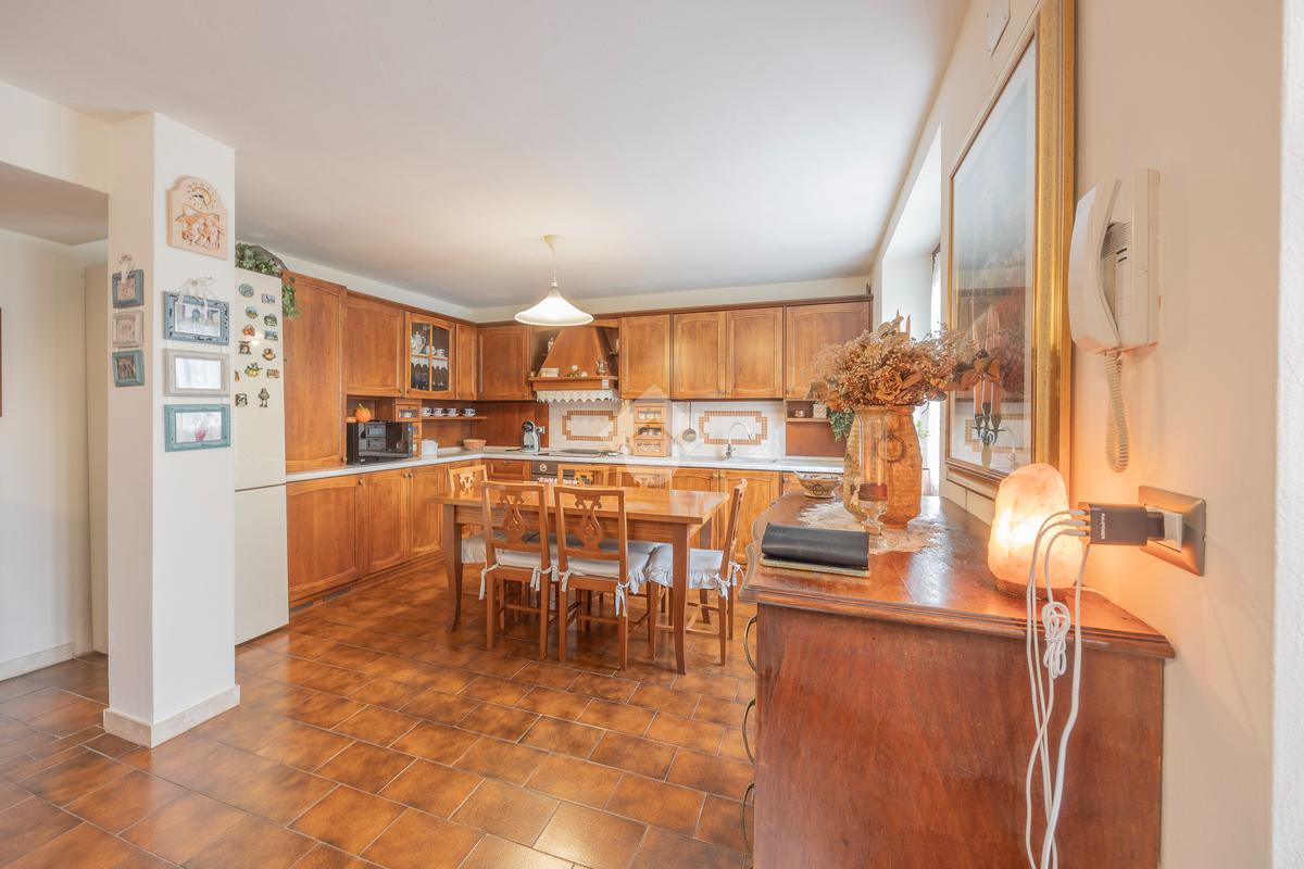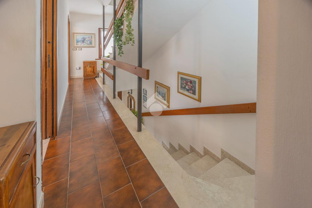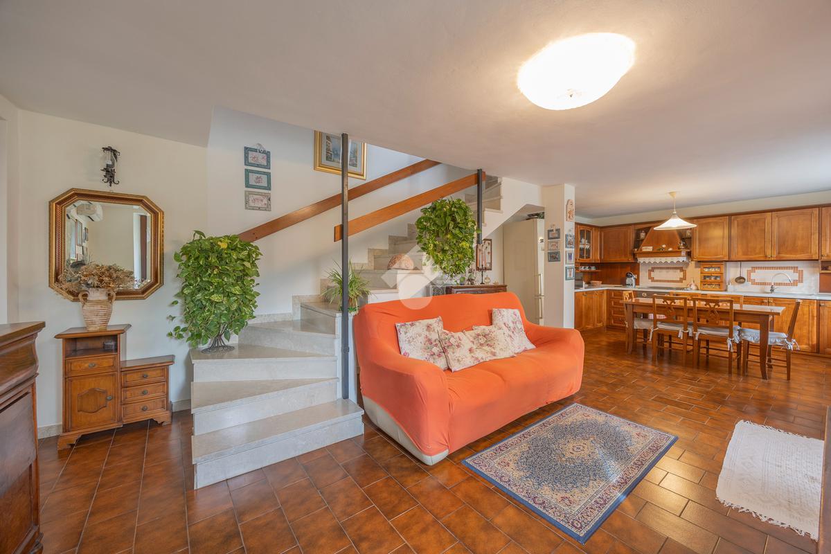 L’ingresso si apre su un’ampia zona giorno open space con scala a vista e cucina in muratura, ambiente caldo e accogliente valorizzato da pavimenti in cotto e finiture in legno che richiamano la tradizione delle abitazioni del centro.