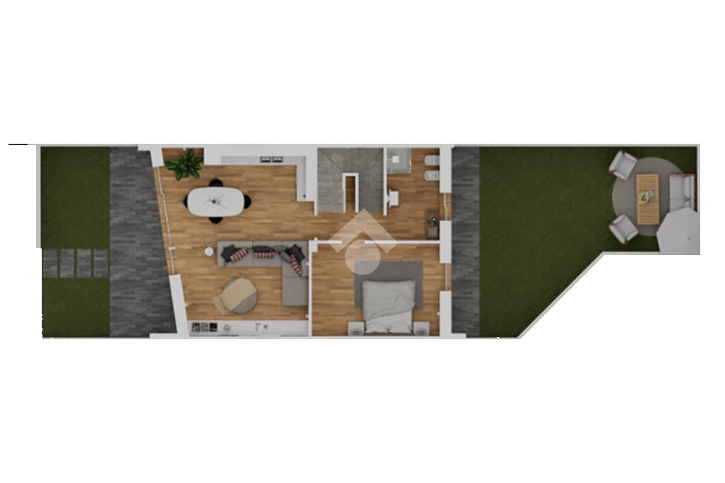 Soggiorno con cucina a vista e grandi vetrate affacciate sul giardinoCamera matrimonialeBagno finestrato